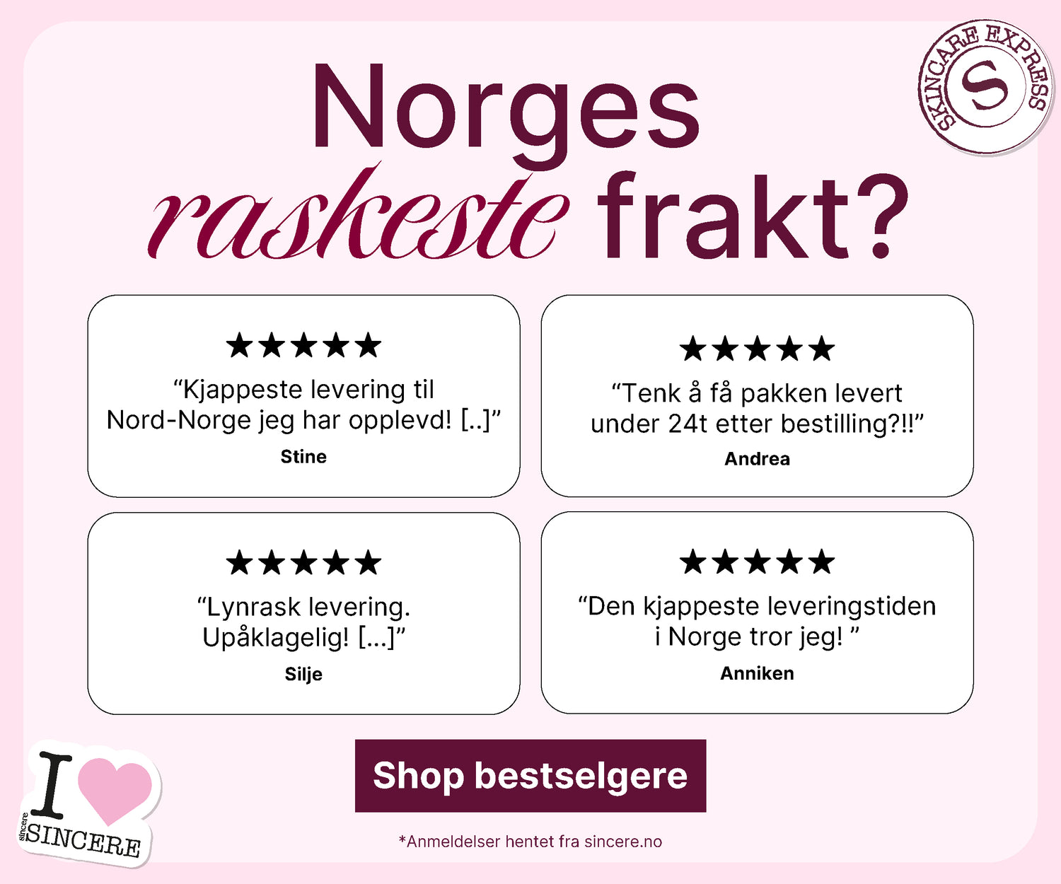 “Elsker kundeservicen, elsker produktene dere selger og har lært masse av jentene som styrer Sincere😍”