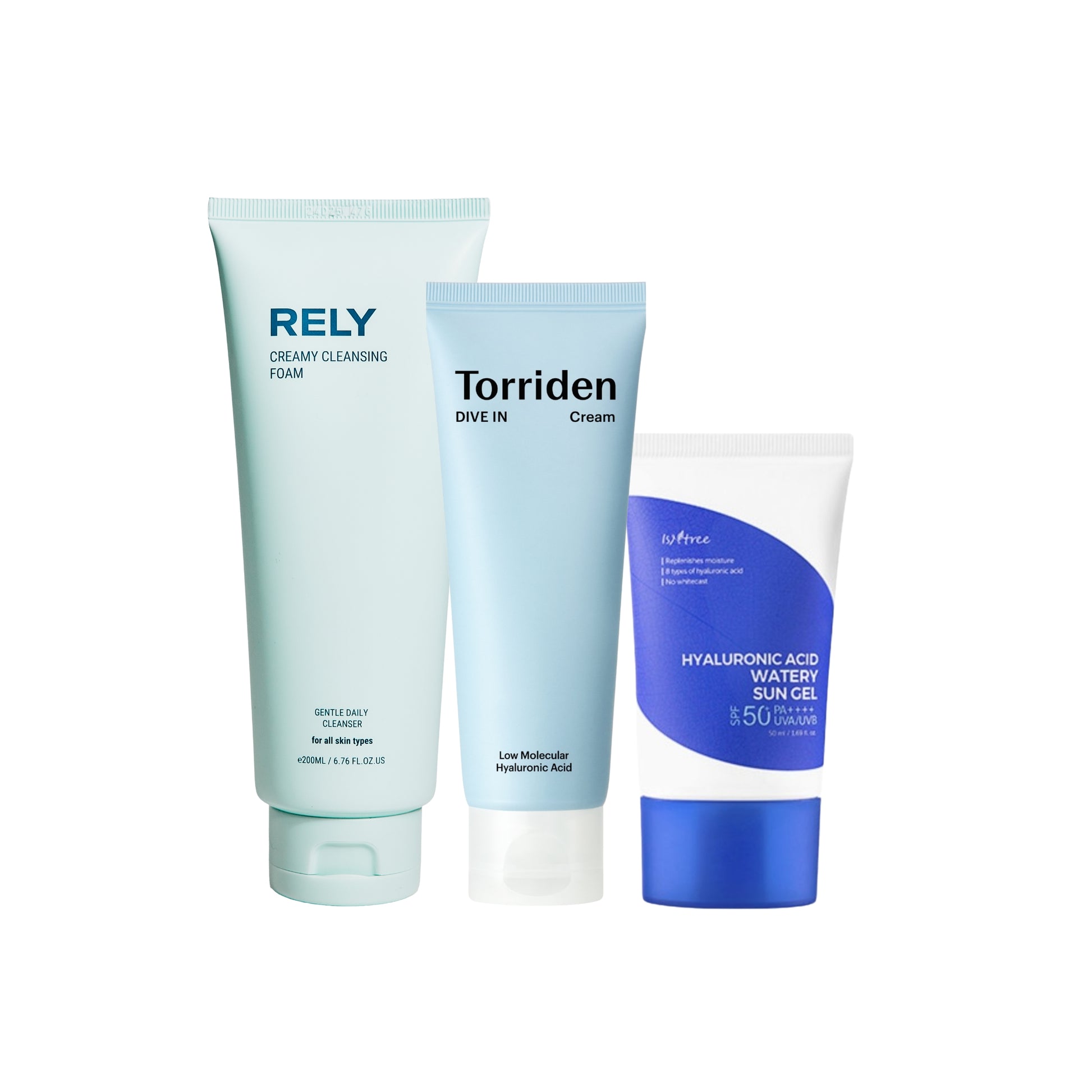 REKKEFØLGE OG BRUK1. RELY Cleansing Foam - Hver morgen og kveld2. TORRIDEN Dive-In Cream - Hver morgen og kveld3. ISNTREE Sun Gel - Hver morgen