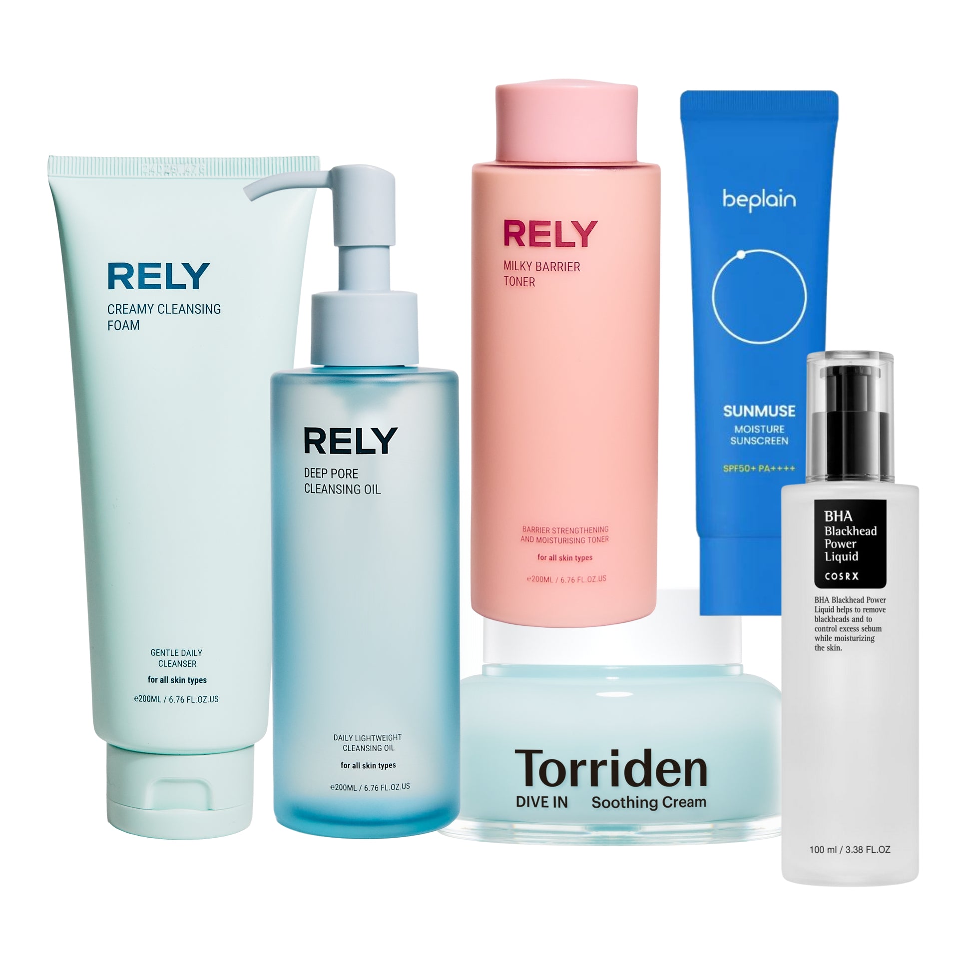 REKKEFØLGE OG BRUK1. RELY Cleansing Oil - Hver kveld2. RELY Cleansing Foam- Hver morgen og kveld 3. COSRX BHA - 1-3 kvelder i uken 4. RELY Milky Toner - Hver morgen og kveld5. TORRIDEN Cream - Hver morgen og kveld6. BEPLAIN Sunscreen - Hver morgen