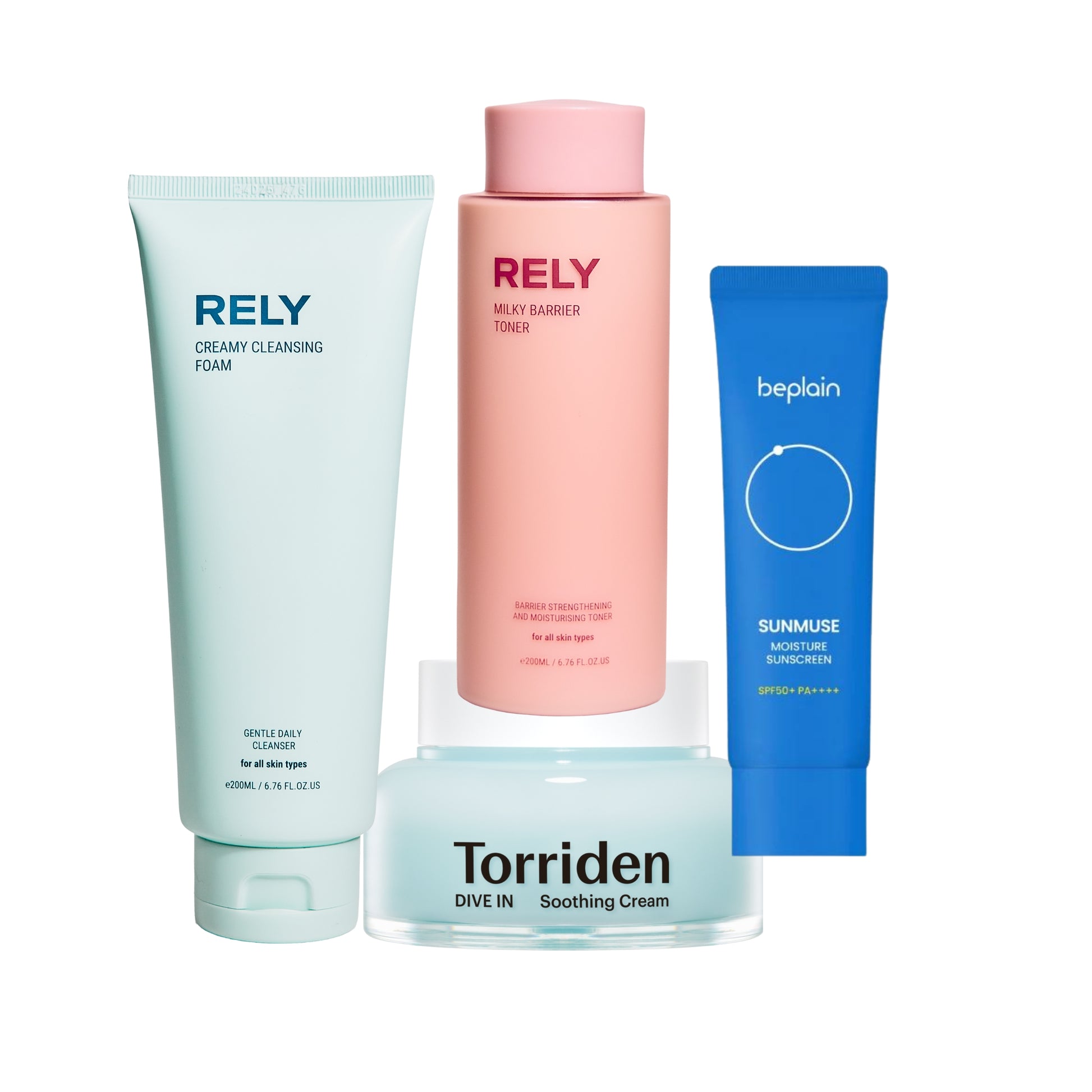 REKKEFØLGE OG BRUK1. RELY Cleansing Foam - Hver morgen og kveld 2. RELY Milky Toner - Hver morgen og kveld3. TORRIDEN Cream - Hver morgen og kveld4. BEPLAIN Sunscreen - Hver morgen
