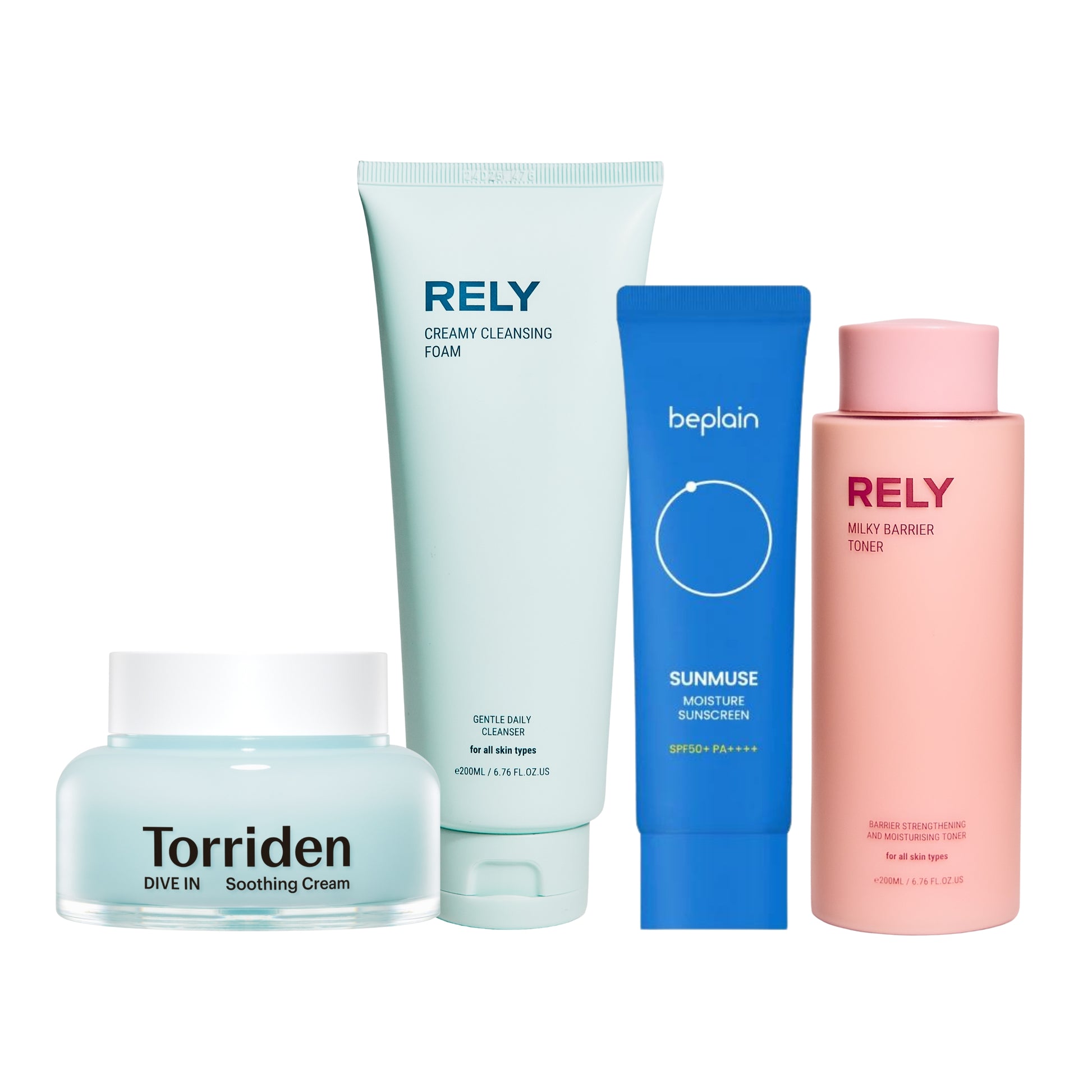 REKKEFØLGE OG BRUK1. RELY Cleansing Foam - Hver morgen og kveld2. RELY Toner - Hver morgen og kveld3. TORRIDEN Soothing Cream - Hver morgen og kveld4. BEPLAIN Sunmuse - Hver morgen
