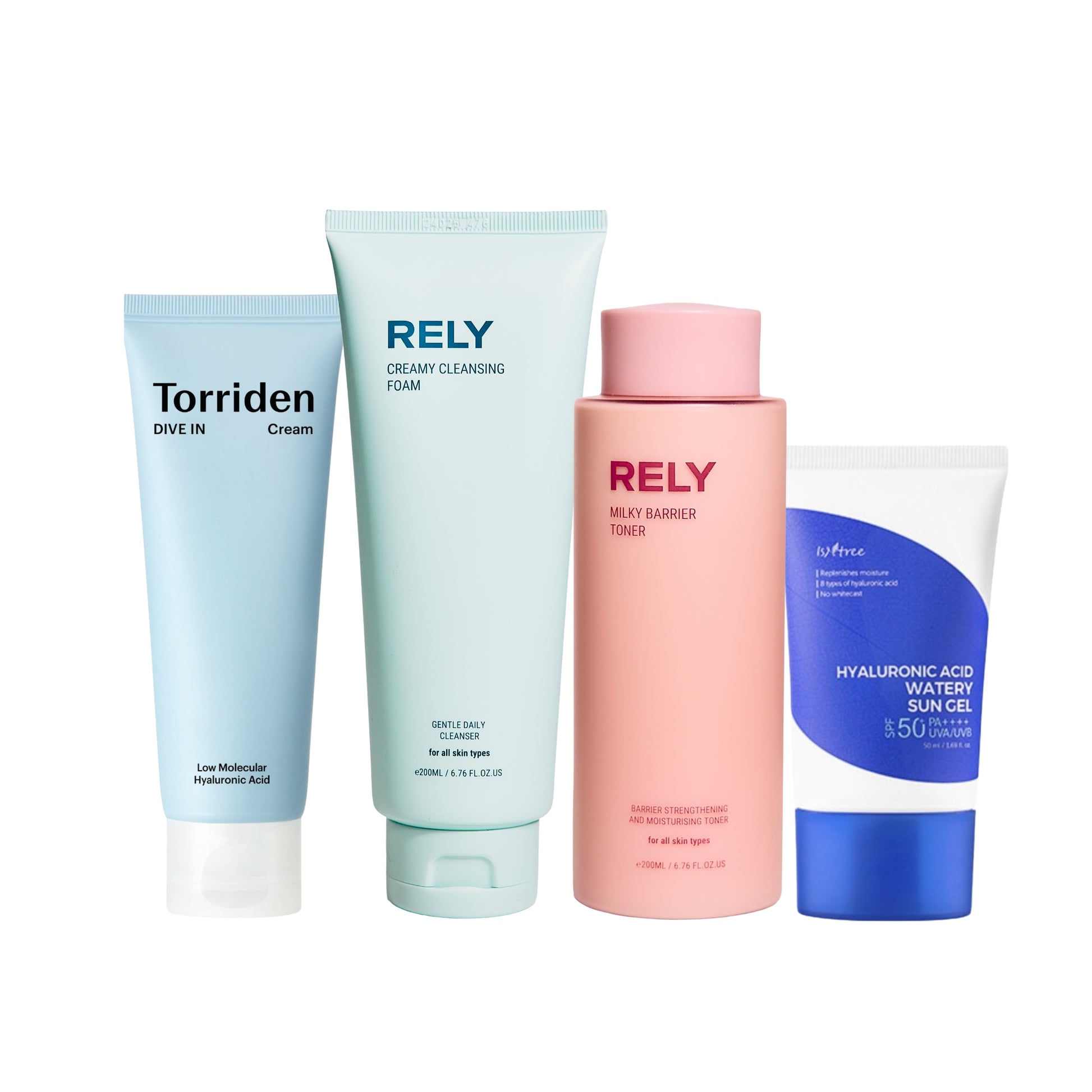 REKKEFØLGE OG BRUK1. RELY Cleansing Foam - Hver morgen og kveld2. RELY Milky Toner - Hver morgen og kveld3. TORRIDEN Dive-In Cream - Hver morgen og kveld4. ISNTREE Sun Gel - Hver morgen