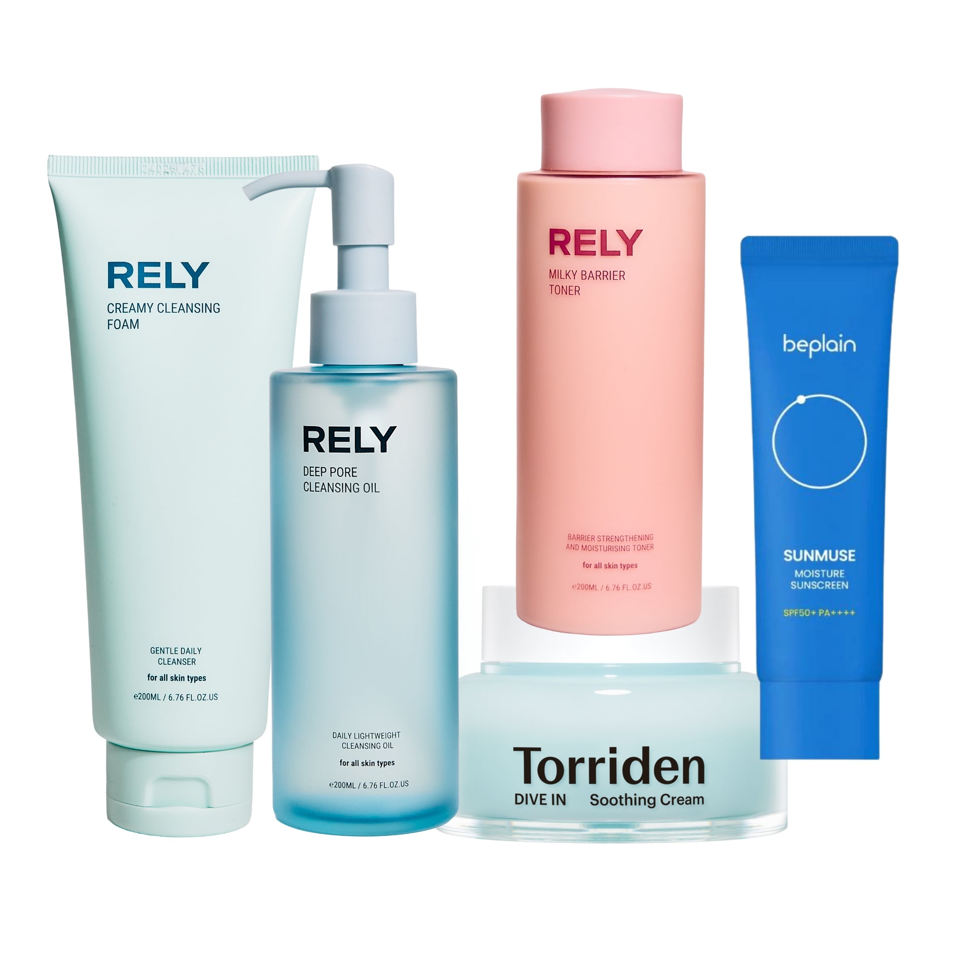 REKKEFØLGE OG BRUK1. RELY Cleansing Oil- Hver kveld2. RELY Cleansing Foam - Hver morgen og kveld3. RELY Milky Toner - Hver morgen og kveld4. TORRIDEN Cream - Hver morgen og kveld5. BEPLAIN Sunscreen - Hver morgen