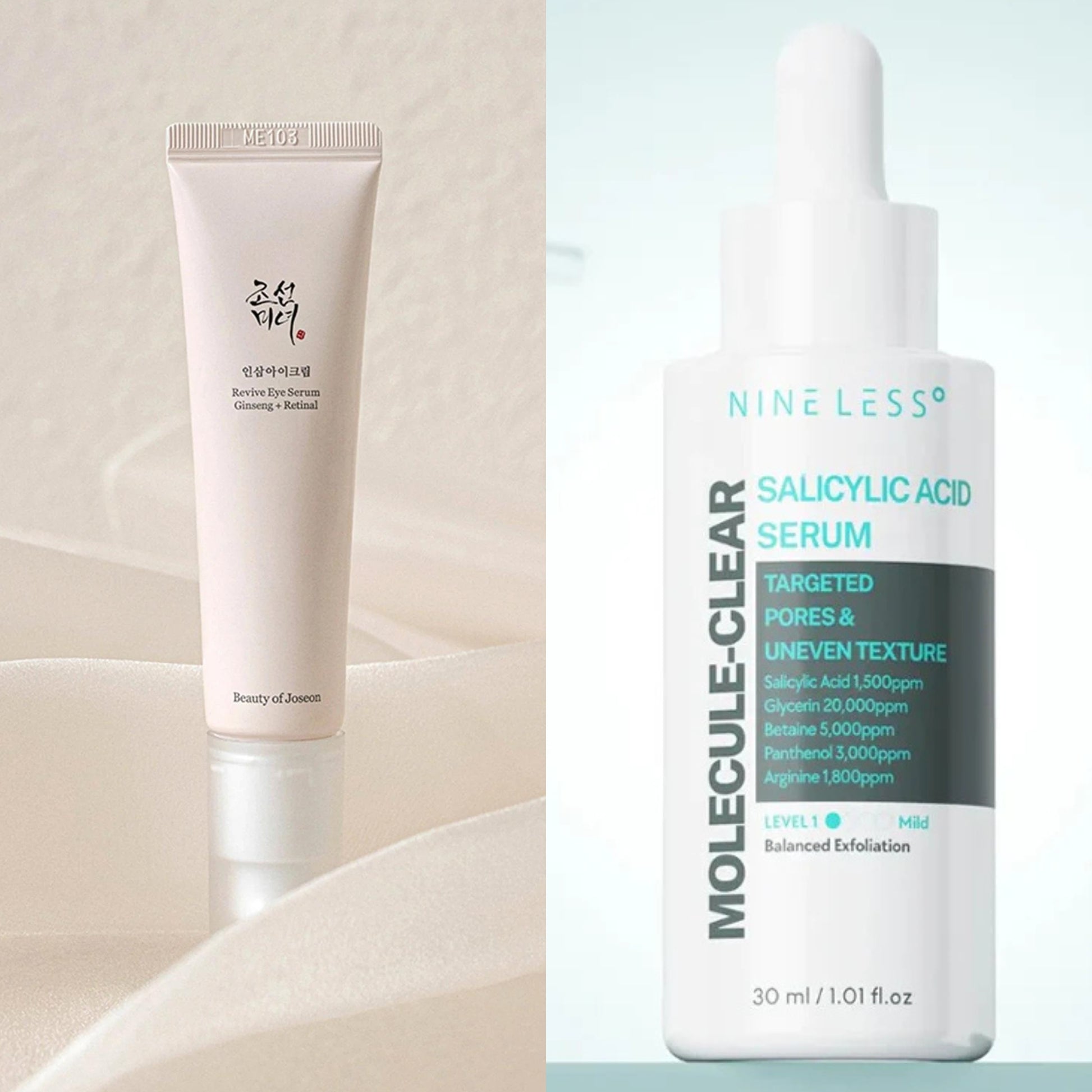 I denne superduoen finner du Nine Less Salicylid acid serum som jobber dypt nede i porene med å løse opp talg, dette både forhindrer og reduserer kviser og utbrudd. Denne har en lav kosentrasjon på 0,15% og kan derfor brukes daglig. Den passer best til nupper, blackheads, svarte prikker på nesen og kviser som ikke er veldig betente og røde.